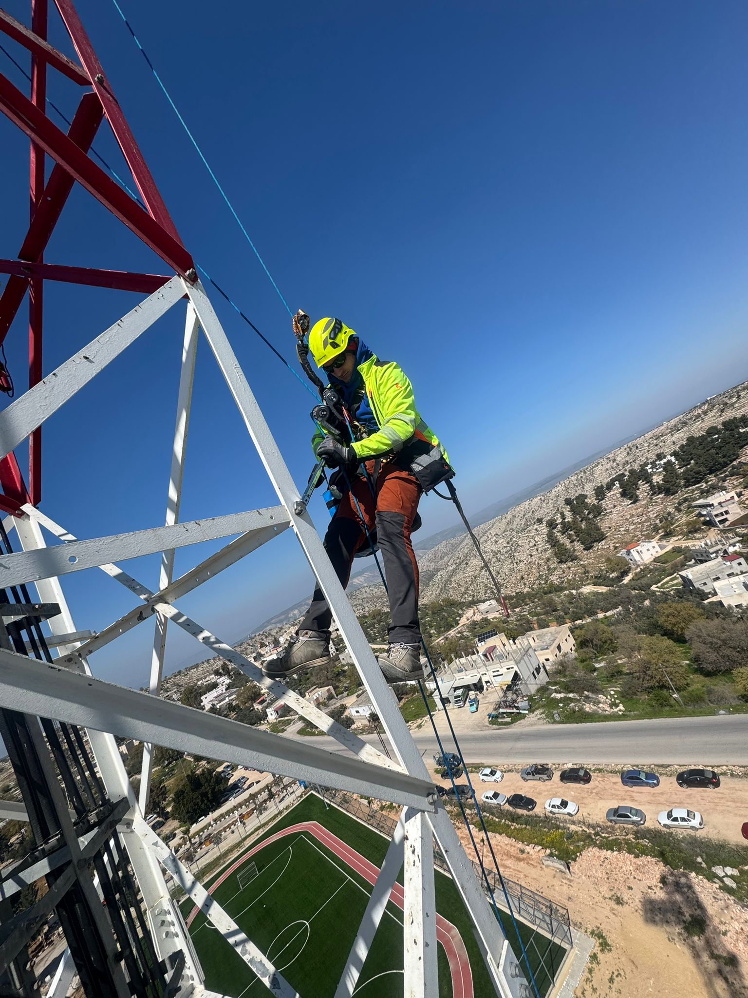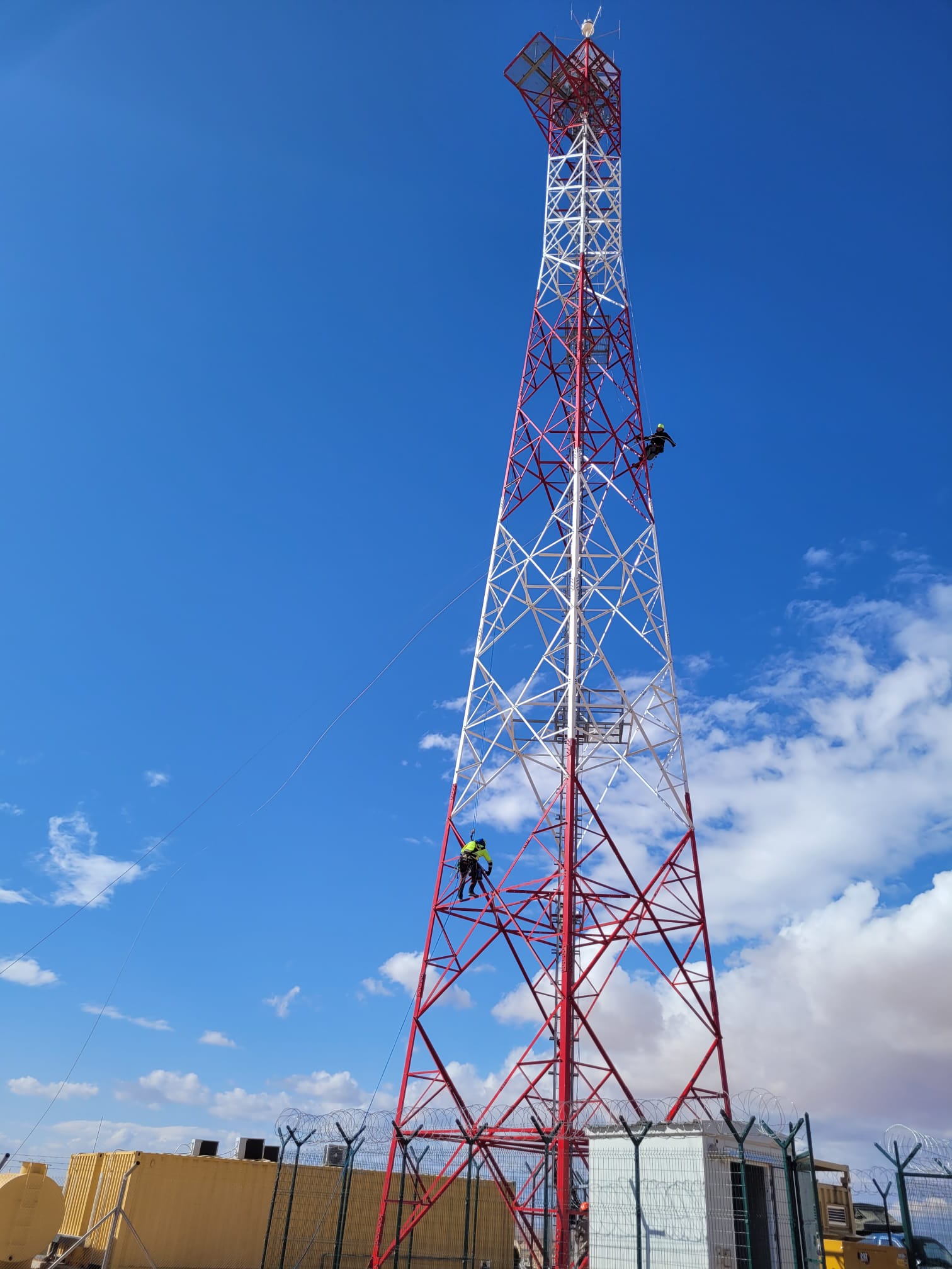 Projekt realizowany na terenie Jordanii obejmował kompleksową inspekcję oraz kontrolę stanu technicznego śrub, drabin i elementów łączących na wieżach przemysłowych. Prace wykonywano w trudnych warunkach klimatycznych — przy silnym wietrze, intensywnym nasłonecznieniu i obecności drobnego piasku unoszącego się w powietrzu.