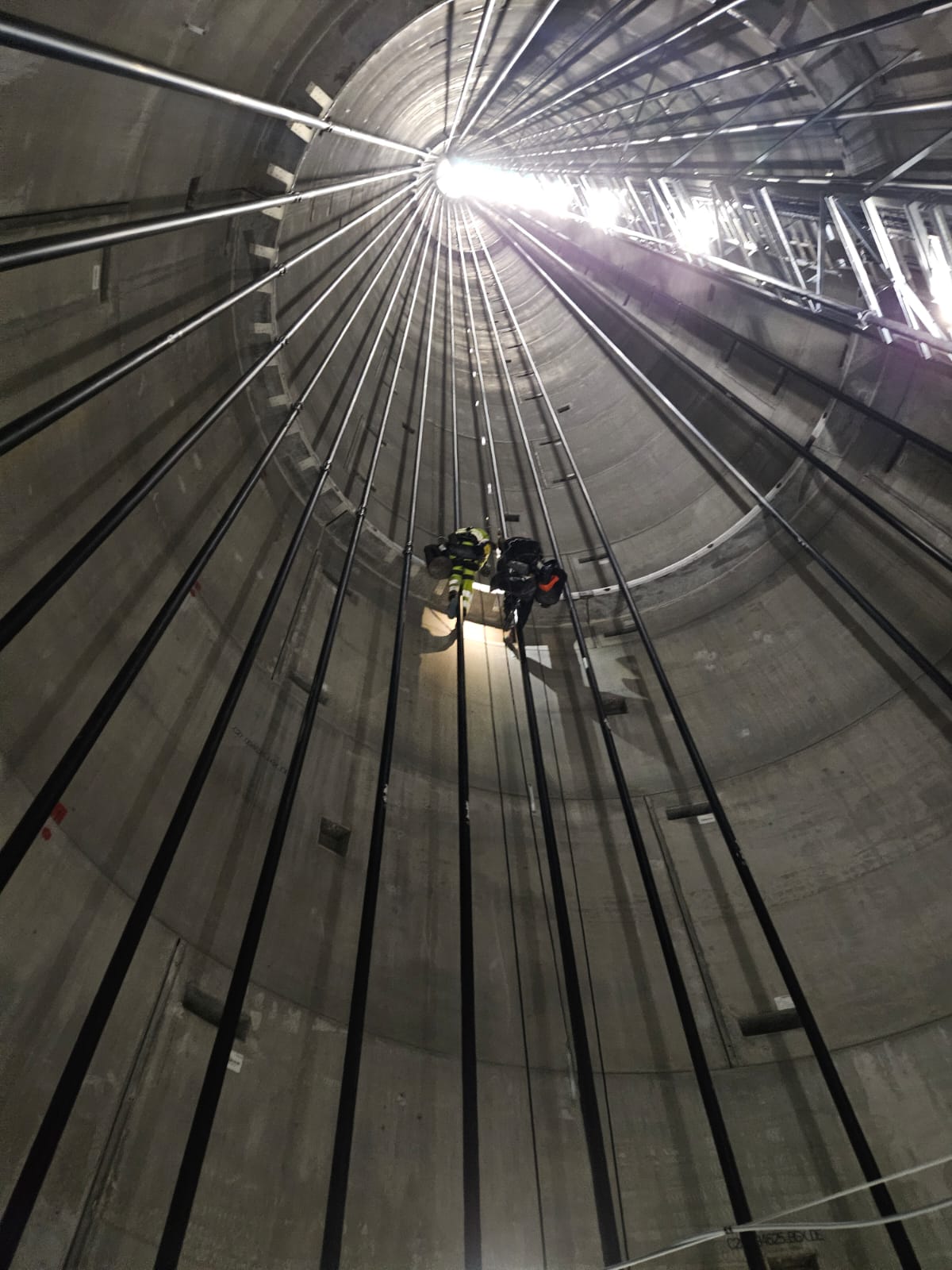 Specyfika środowiska pracy wewnątrz wieży — cylindryczna geometria, ograniczone oświetlenie i konieczność precyzyjnego poruszania się na linach — wymagała od zespołu wysokich kompetencji i doświadczenia w obu dziedzinach jednocześnie.